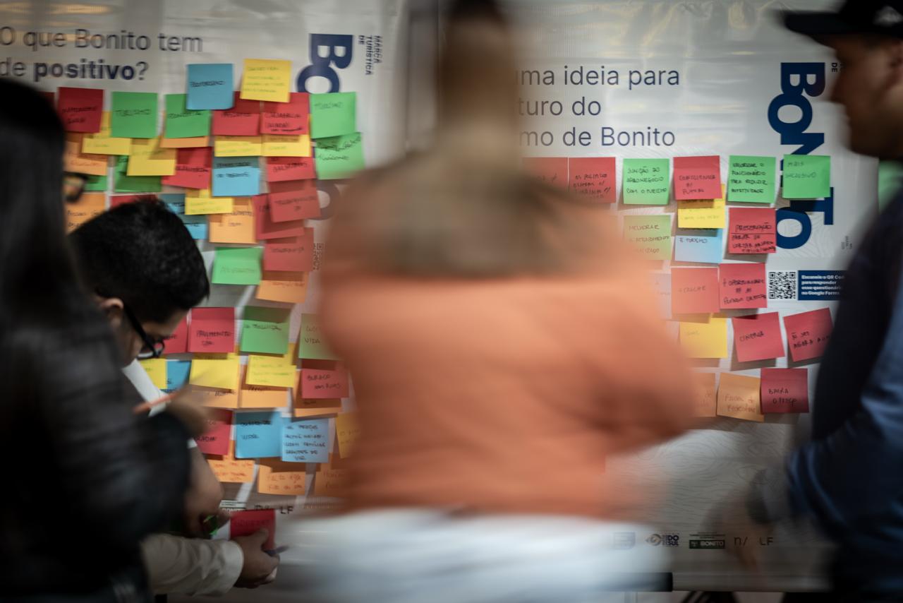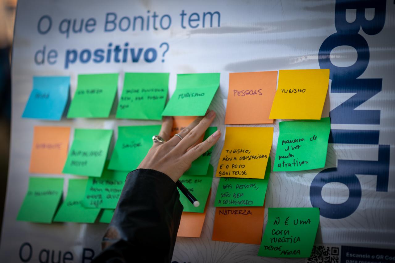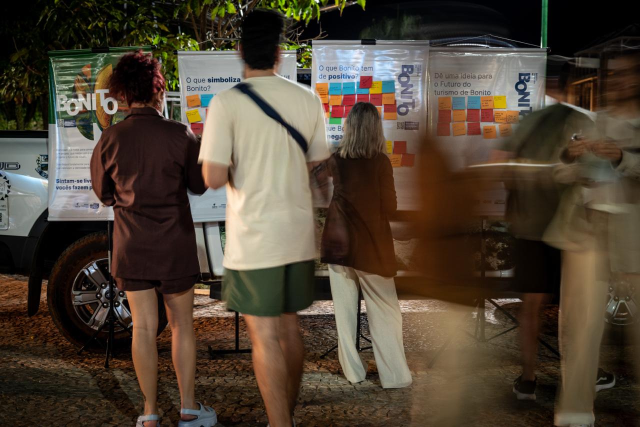 Antes de qualquer posicionamento, mergulhamos no lugar, reunimos moradores, lideranças locais, representantes do setor de turismo, visitantes e poder público num processo denso de cocriação, com workshops, entrevistas e painéis abertos em espaços públicos da cidade. Não para coletar opiniões, mas para entender o que Bonito sabe sobre si mesmo e o que ainda não consegue articular sobre seu próprio futuro.